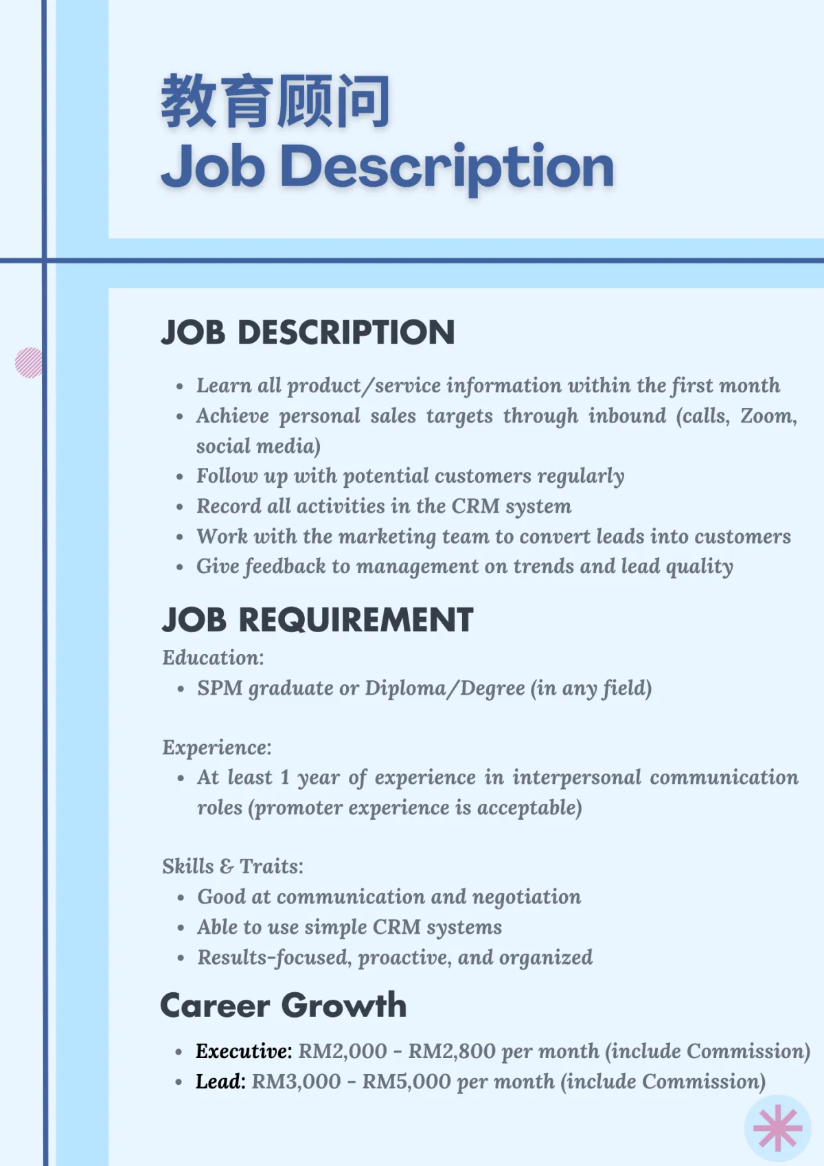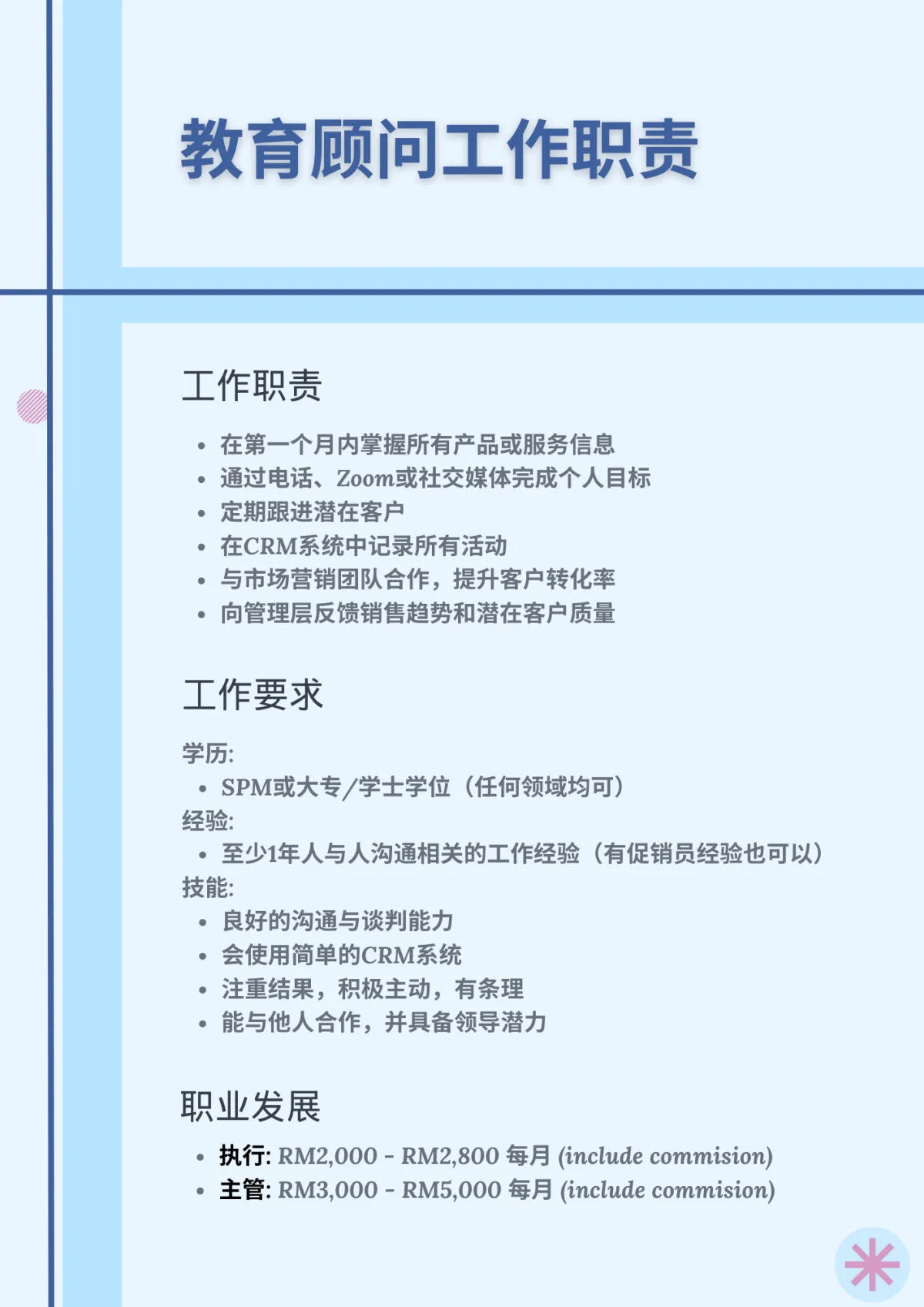 联系HR:WhatsApp 0102810109,注明 “我有兴趣成为教育顾问” 。我们的HR会发送详细的申请流程给你。